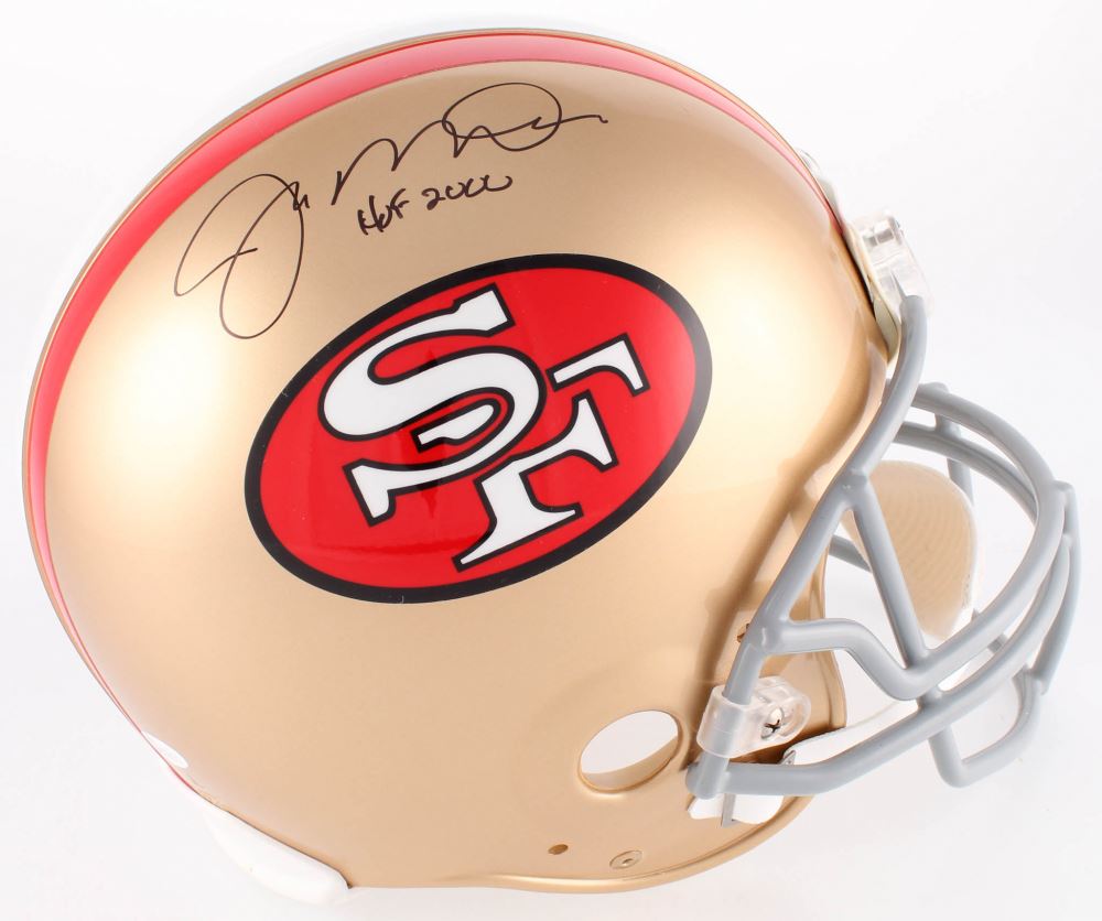 Riddell San Francisco 49ers authentic on-field full-size helmet. Hand-signed in black felt-tip pen by Joe Montana (HOF).