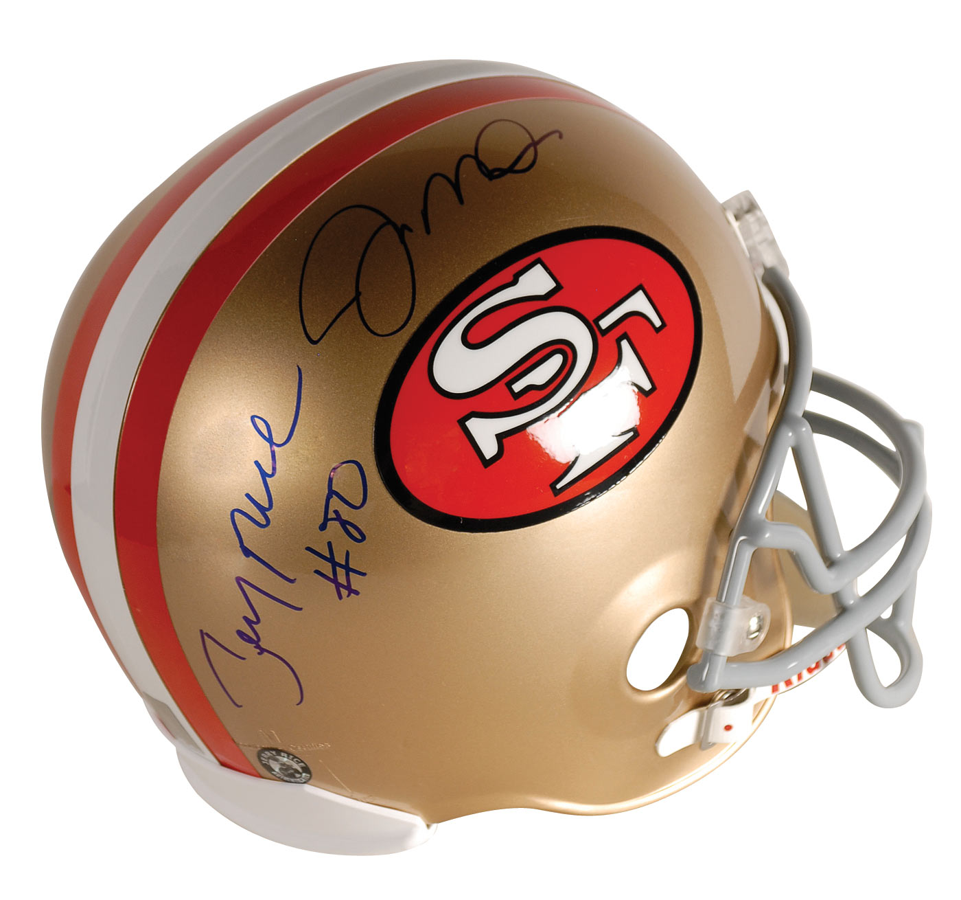 Official Riddell replica San Francisco 49ers football helmet signed in blue felt tip on the side by Hall of Famers Joe Montana and Jerry Rice. In very fine condition.