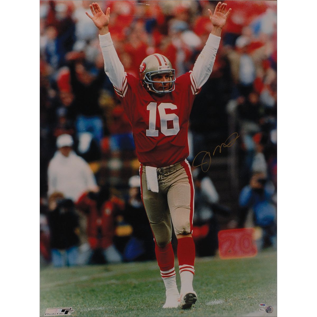 Huge color satin-finish 30 x 40 photo of Montana signaling a touchdown, signed in gold ink. Rolled and in fine condition, with a few scattered surface marks and a PSA/DNA authentication label affixed to corner.
