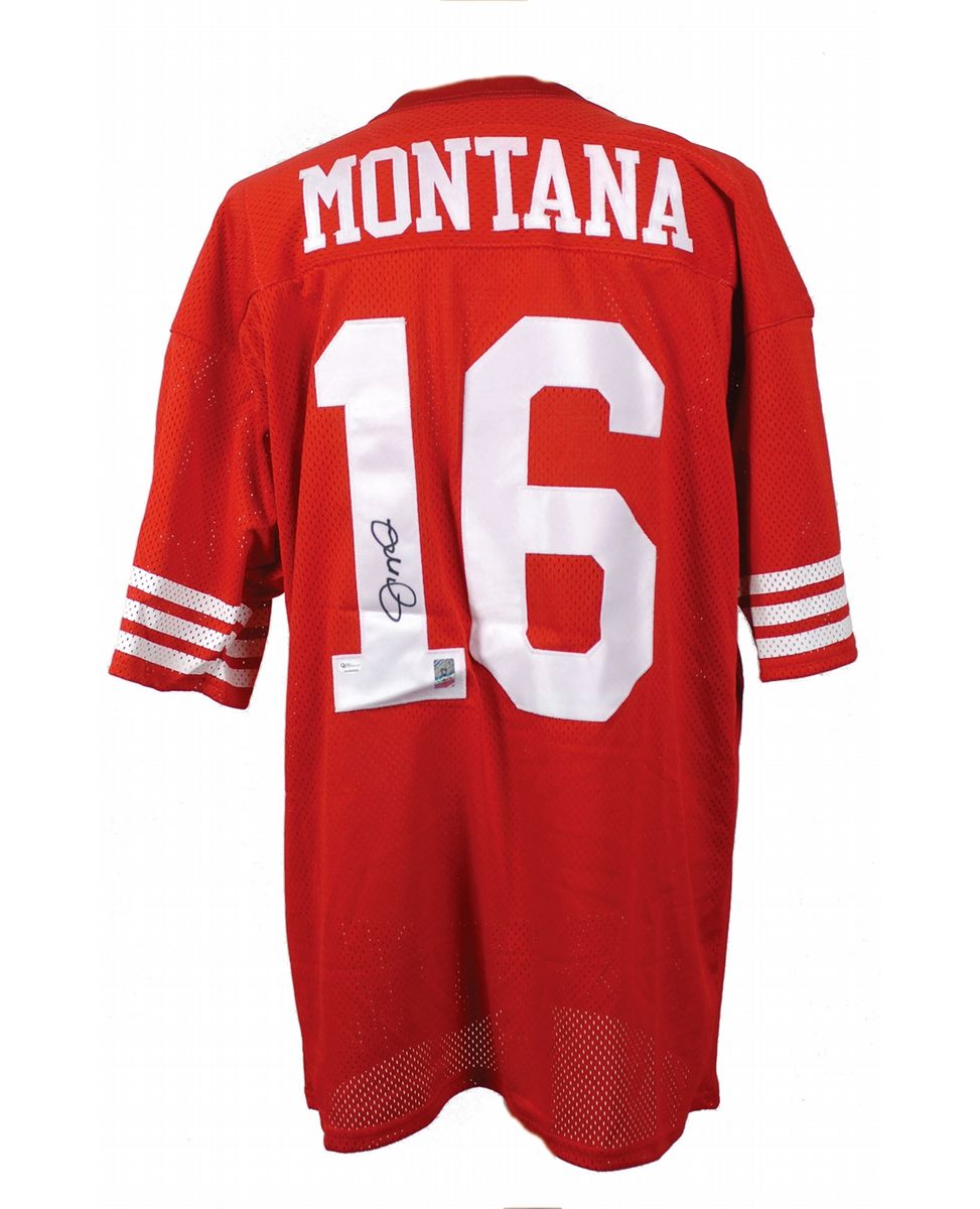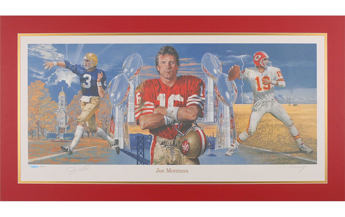 Two items: first, a color limited edition 32.5 x 15.5 print showing illustrations of Montana throughout his career, numbered 32/1400, signed in the lower border in pencil by Montana. Also signed by the artist, Merv Corning. Matted in red and gold to an overall size of 37 x 20. Second, a replica 49ers jersey, with sewn on numbers and letters, signed on the number on the back in black felt tip. In overall fine condition.