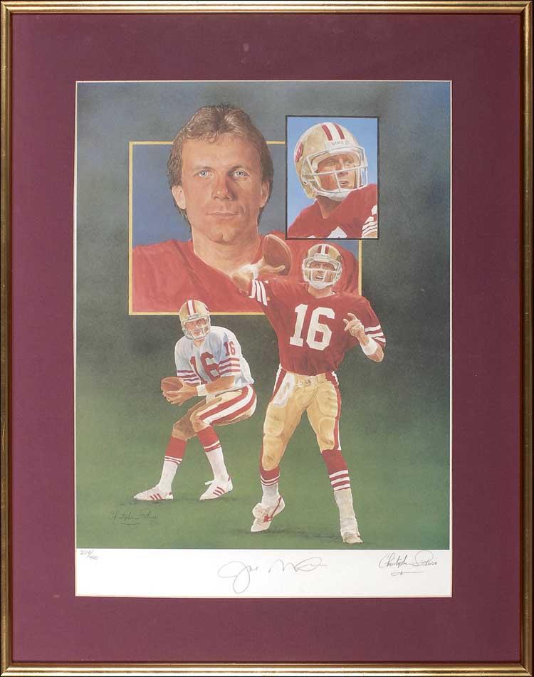 Color limited edition composite lithograph of the San Francisco quarterback, numbered 224/400, 16 x 24, signed in pencil by Montana and the artist, Christopher Paluso. Matted and framed to an overall size of 22 x 28. In fine condition. Oversized. Pre-certified Steve Grad/PSA/DNA and RRAuction COA.