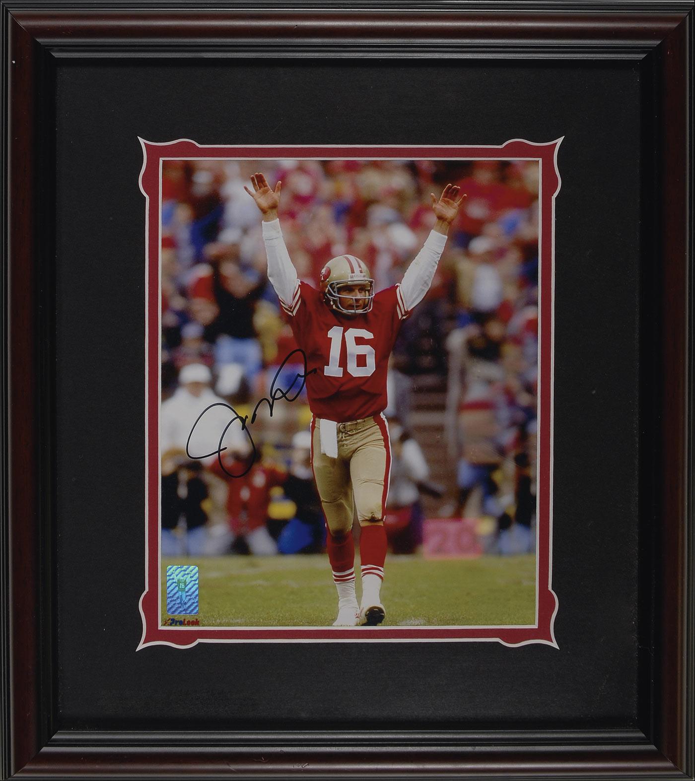 Color glossy 8 x 10 photo of Montana celebrating a touchdown, signed in black felt tip. Double matted and framed to an overall size of 14 x 16. In very fine condition, with an authentication hologram affixed to lower right. Pre-certified Steve Grad/PSA/DNA and RRAuction COA.