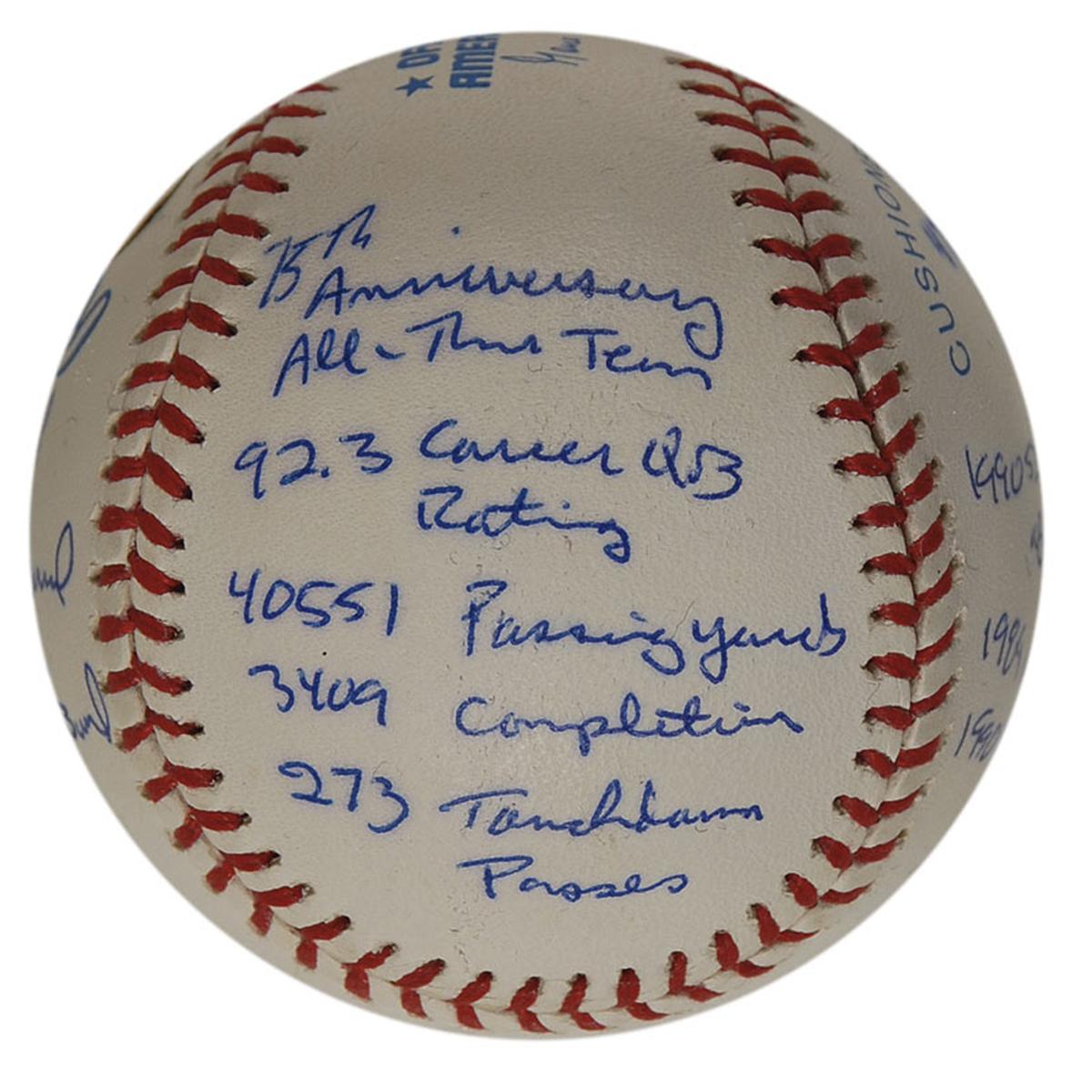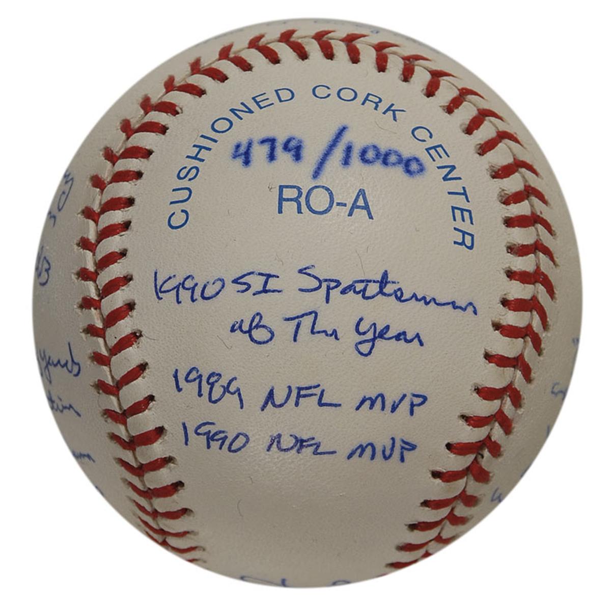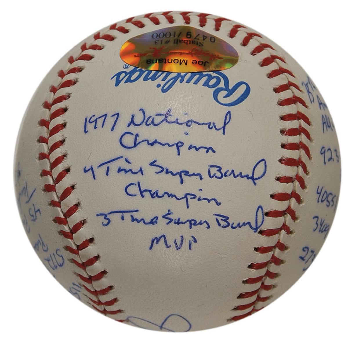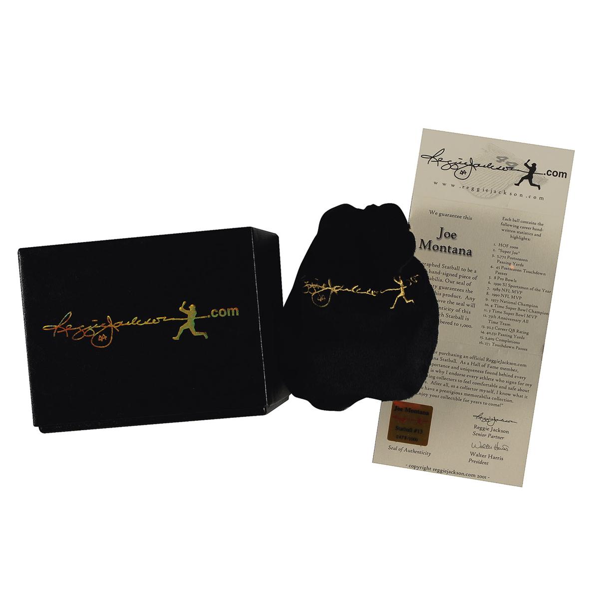 Official limited edition Rawlings American League baseball, #479/1000, signed in blue ballpoint on the sweet spot, “Joe Montana HOF 2000,” with Montana adding 15 of his career statistics. In fine condition, with a bit of scattered light spreading of ink to some of the statistical information. Accompanied by a Reggiejackson.com certificate of authenticity, as well as its original cloth bag and box.