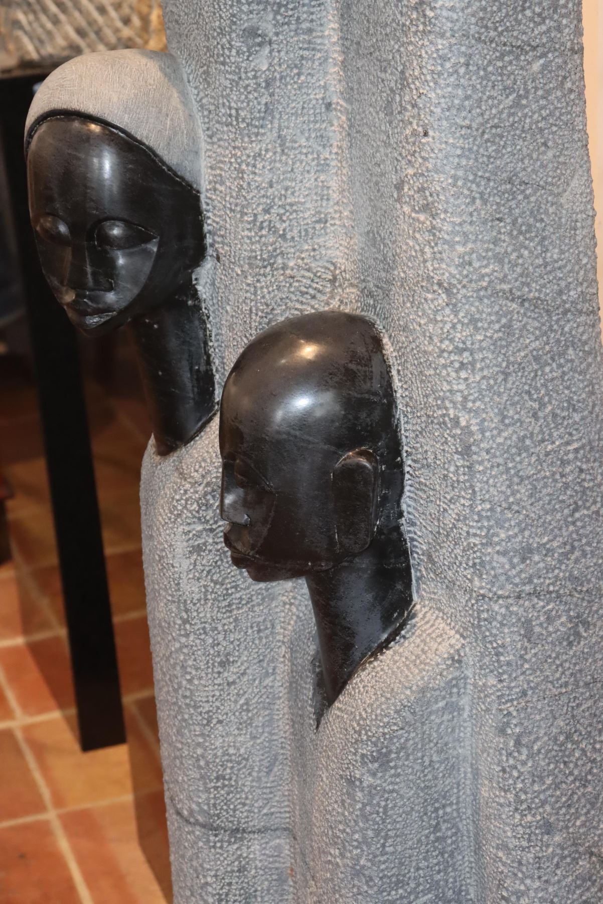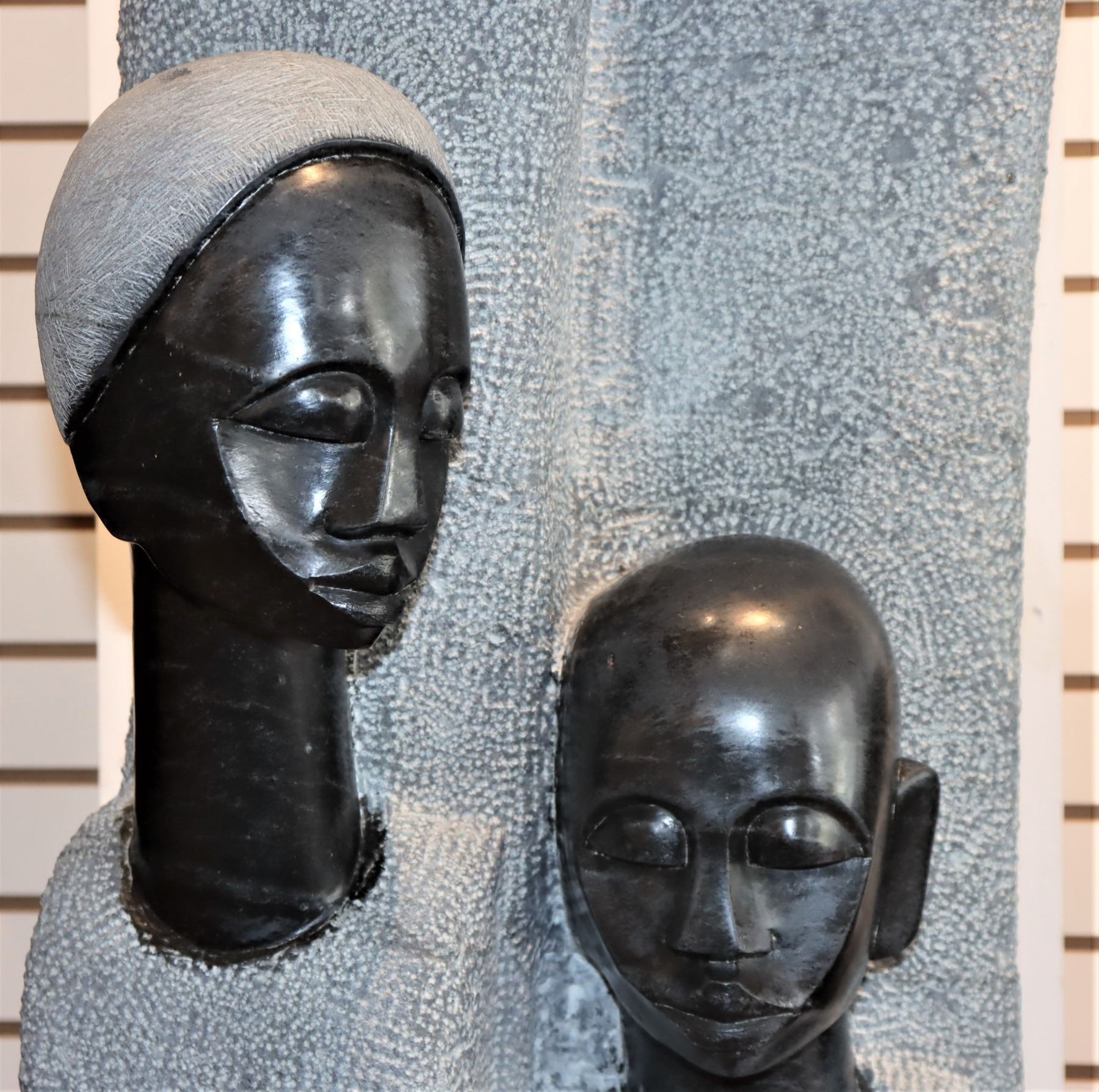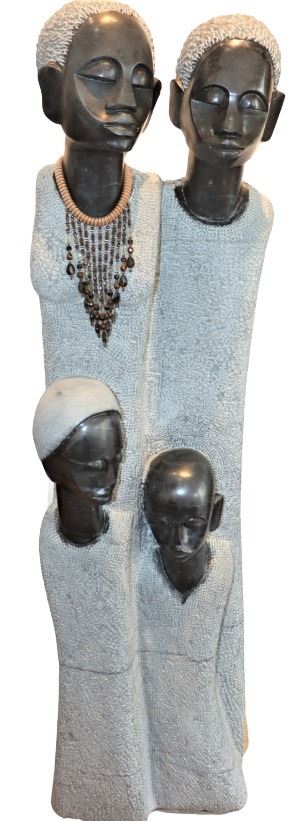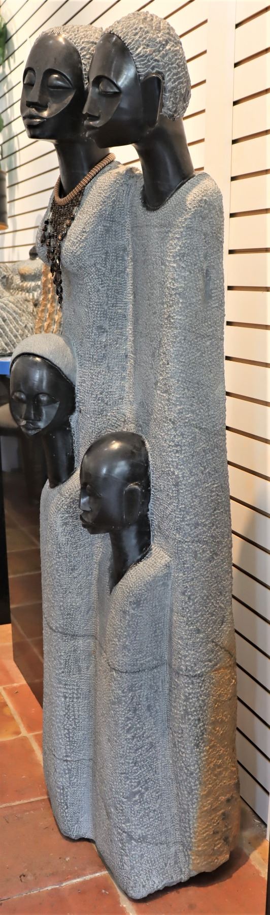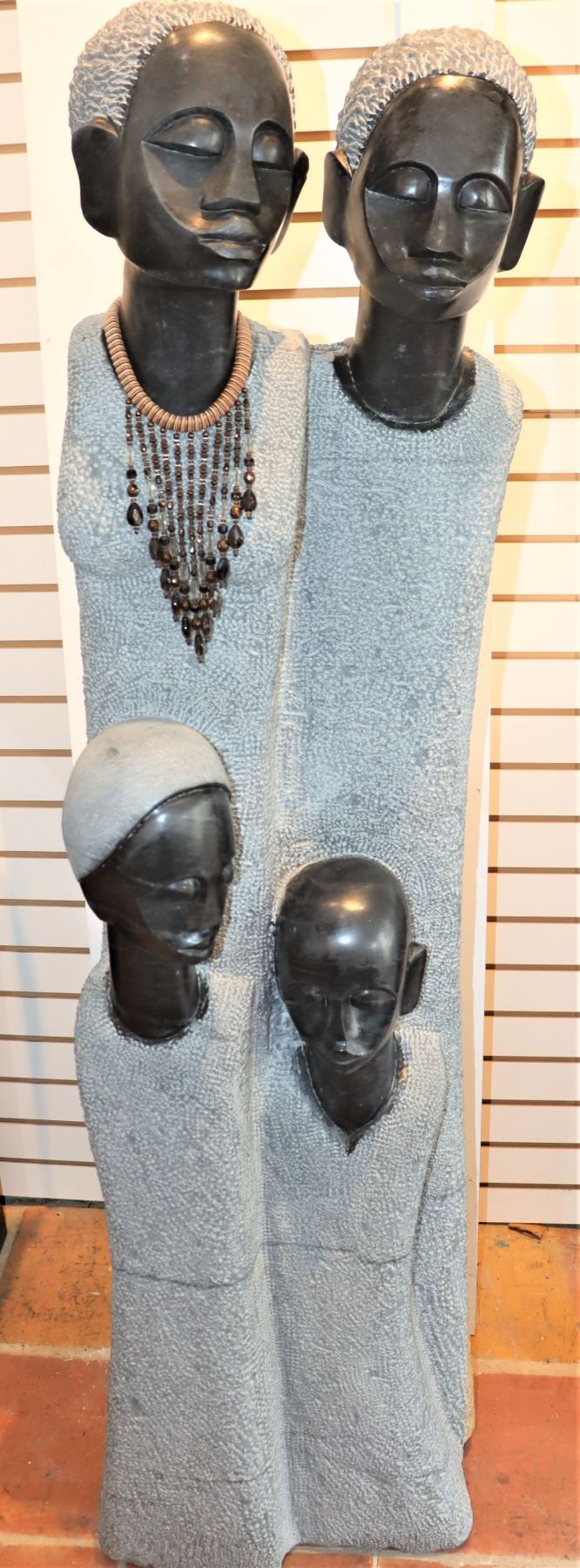 Majestic sculpture of a group of four family members, parents and children. Created from locally sourced Serpentine stone, signed at back of base: Joe Mutasa '99.Joe Mutasa is one of the most prominent names of the second generation of Zimbabwean sculptors. As a sculptor with over 30 years’ experience, he has travelled widely as a resident artist at a number of high-profile international exhibitions. His work has also been featured in innumerable local and international joint and solo exhibitions. His graceful sculptures with their fine proud features are instantly recognizable and much sought-after by collectors worldwide.