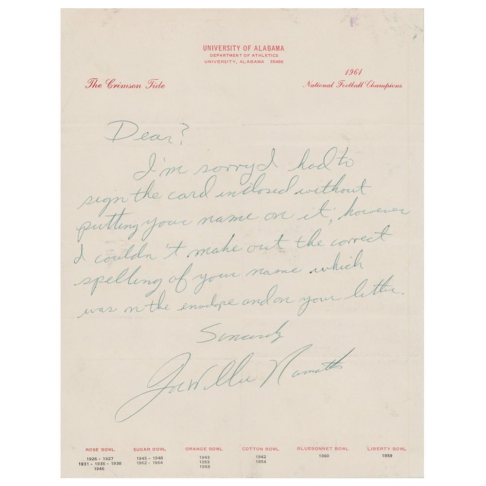 ALS signed ‰ÛÏJoe Willie Namath,‰Û one page, 8.5 x 11, University of Alabama letterhead, no date but circa early 1960s. Letter to an autograph seeker, in full: "Dear ?, I'm sorry I had to sign the card enclosed without putting your name on it; however I couldn't make out the correct spelling of your name which was on the envelope and on your letter." In very good to fine condition, with intersecting folds and light creasing. Namath quarterbacked the Alabama Crimson Tide from 1962 to 1964, leading them to a national championship in his senior year.