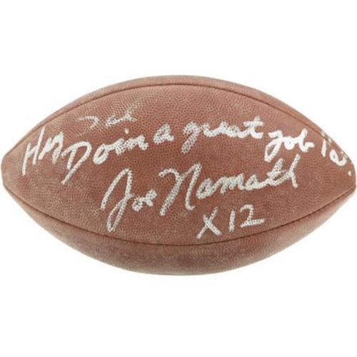 <B>Joe Namath SigneD Football.</B></I> Dramatic Hall of Fame gunslinger Joe Namath has applied a perfect silver signature to the football we provide here, adding inscription that reads "Hey Sal -- Doin a great job Pal." <I>LOA from PSA/DNA.</B></I><BR><BR><b>Shipping:</b> Balls, Pucks, etc., Small (<a target="_blank" href="http://www.heritageauctions.com/common/shipping.php">view shipping information</a>)
