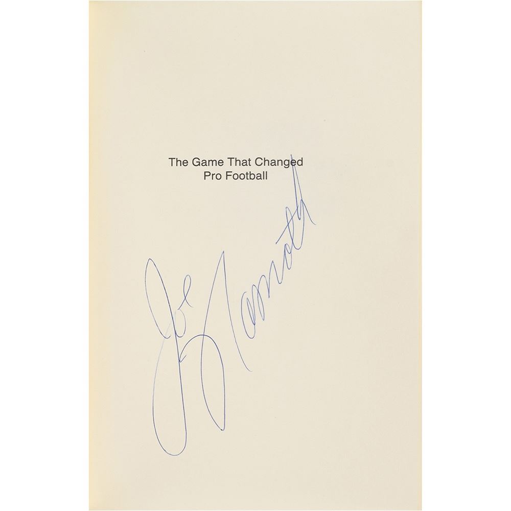 Signed book: The Game That Changed Pro Football. First edition. NY: Birch Lane Press, 1989. Hardcover with dust jacket, 6.5 x 9.25, 216 pages. Signed on the half-title page in blue ballpoint by Joe Namath. In fine condition.