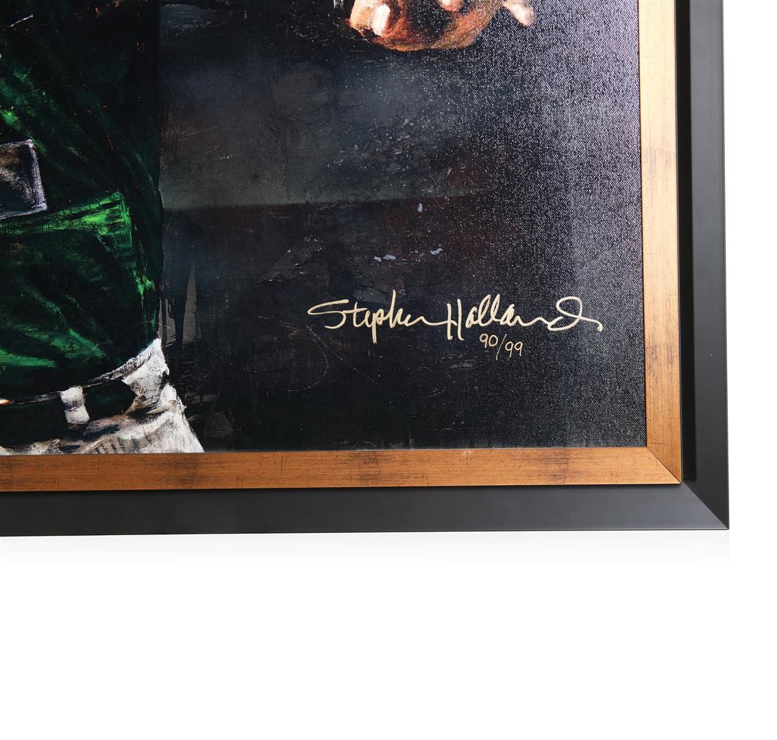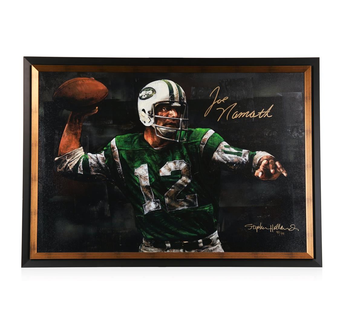 Published 2006. Limited Edition giclee on canvas. Hand Enhanced. Dimensions 29" x 41". There are 99 pieces signed and numbered by Stephen Holland & Joe Namath enhanced giclee. This limited edition rendition is numbered "90 of 99", and is singed very boldly in gold Sharpie, with the artist Stephen Holland signature down below.