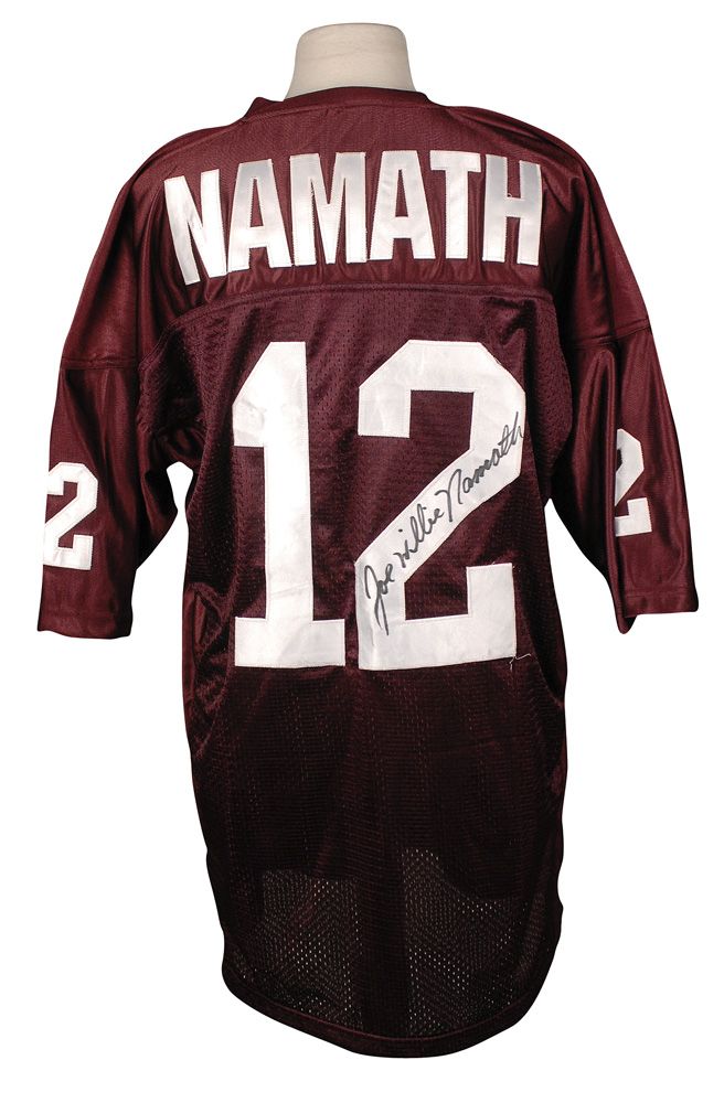 Replica Alabama Crimson Tide football helmet, with sewn on letters and numbers, signed in black felt tip on the number on the back, “Joe Willie Namath.” In fine condition.