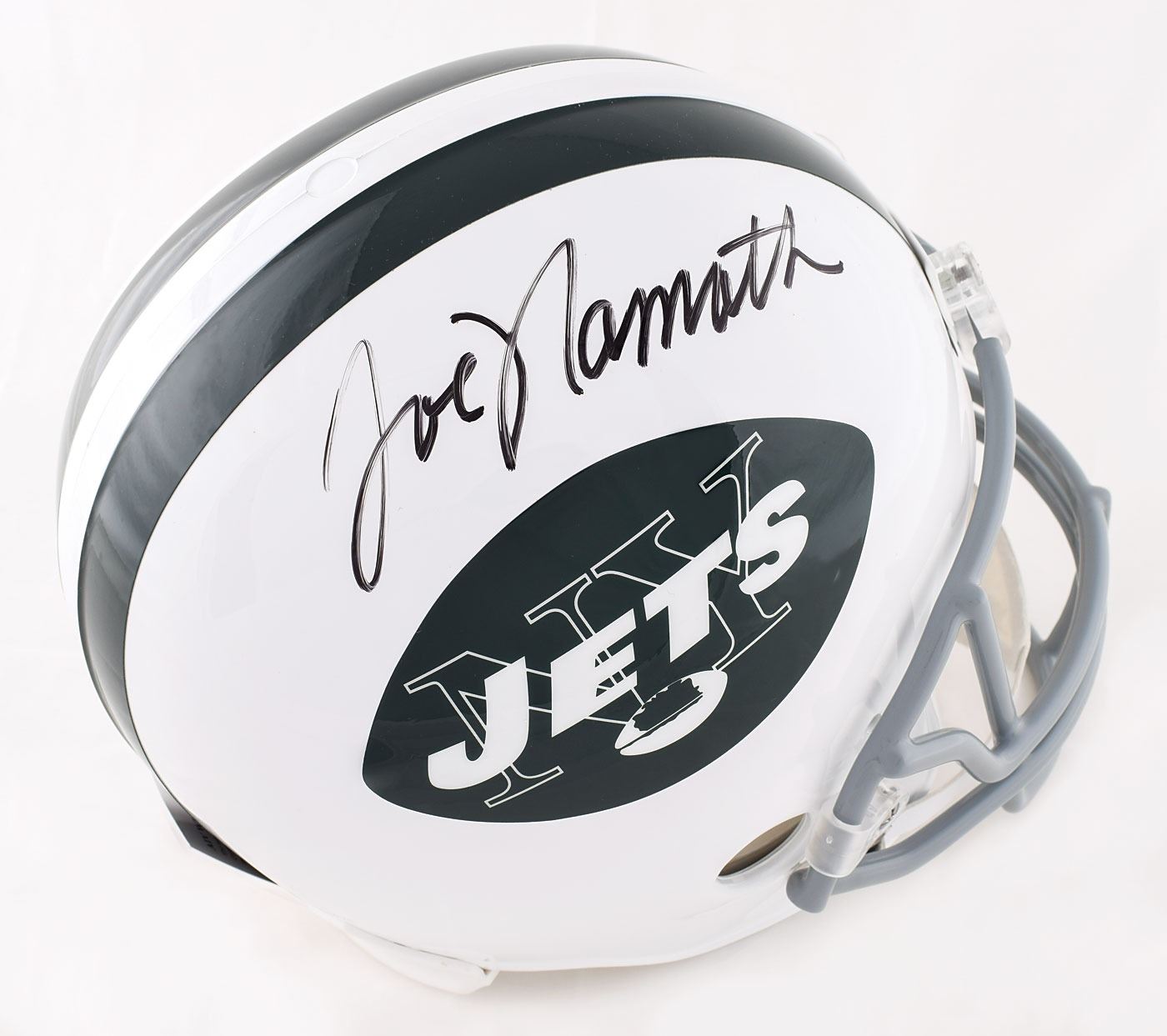 Full-size official Riddell New York Jets replica football helmet signed on the upper shell in black felt tip by Joe Namath. In fine condition. Accompanied by the original box.