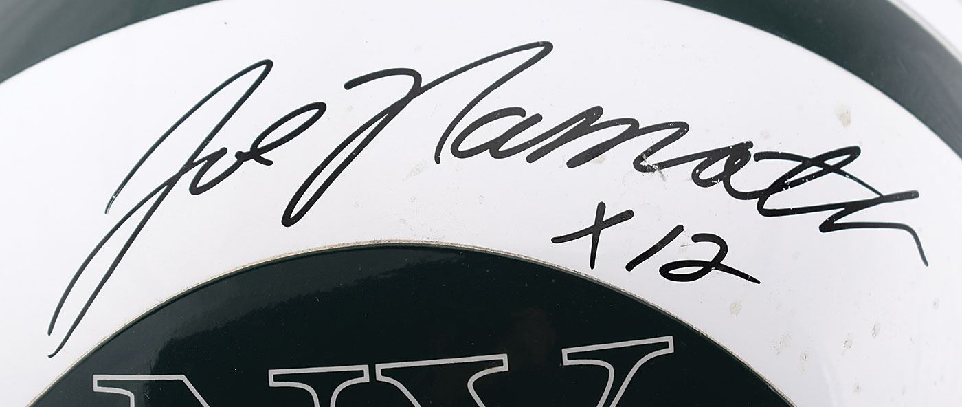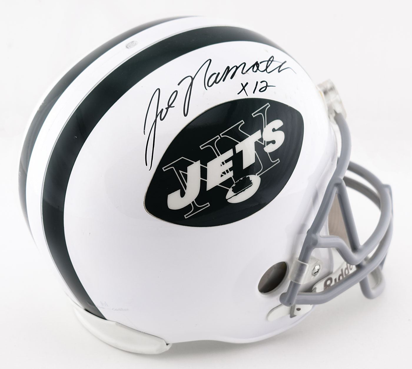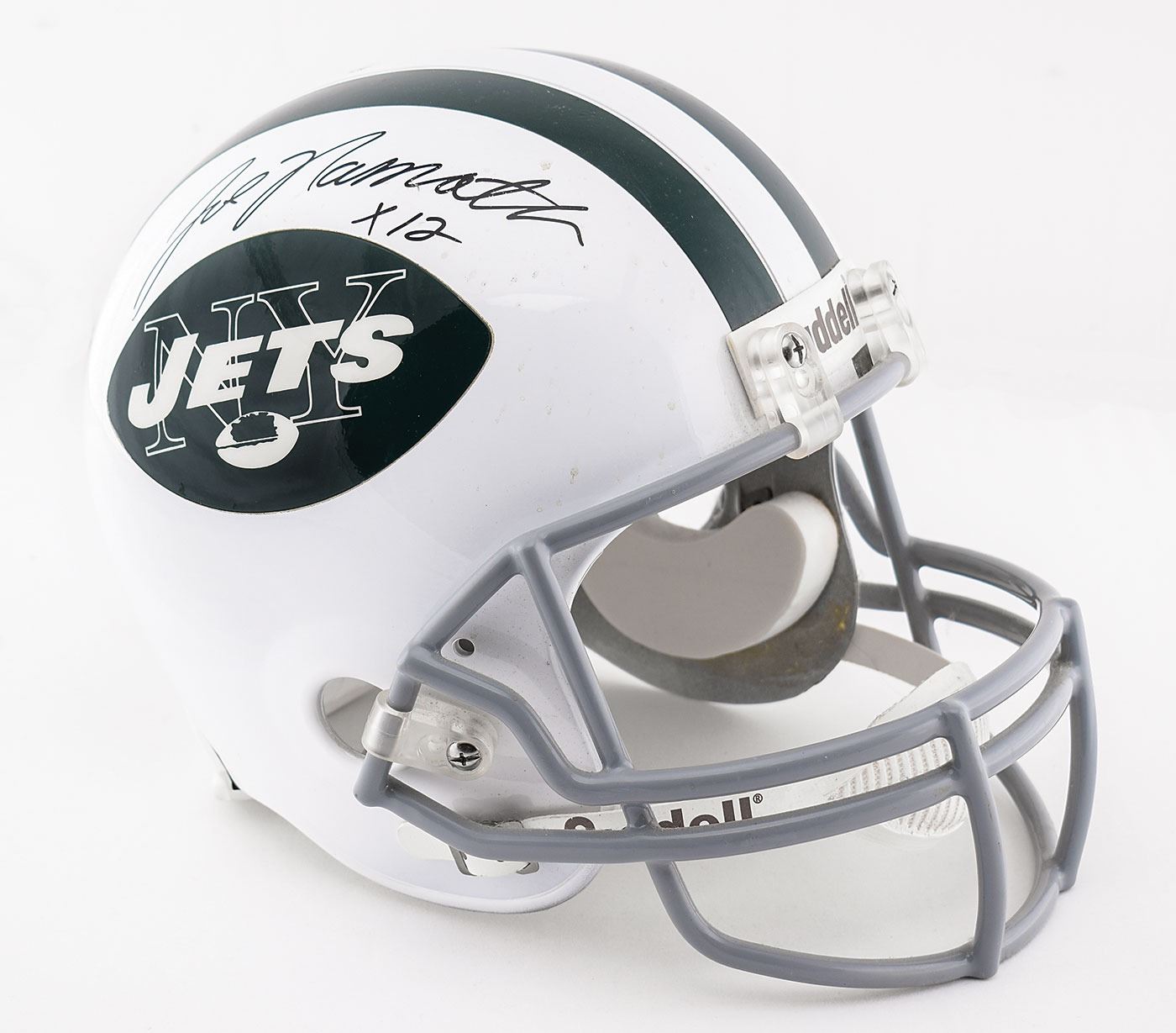 Official Riddell full-size replica New York Jets football helmet, signed on the side in black felt tip, "Joe Namath #12." In fine condition.
