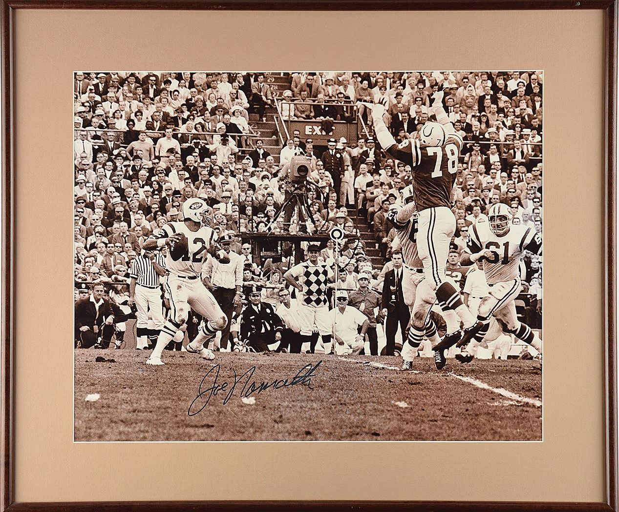 Impressive satin-finish 19.5 x 15.5 photo of Namath dropping back for the New York Jets, signed in black felt tip. Matted and framed to an overall size of 25.5 x 21.5. In fine condition.