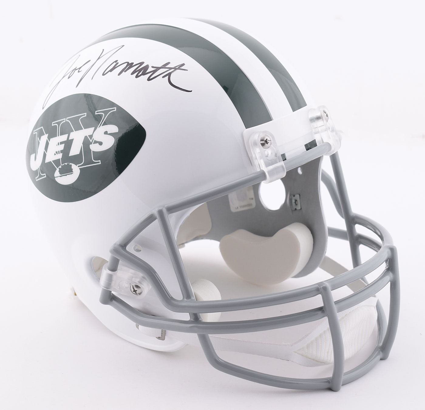 Full-size official Riddell New York Jets replica football helmet signed on the upper shell in black felt tip by Joe Namath. In fine condition. Accompanied by the original box.