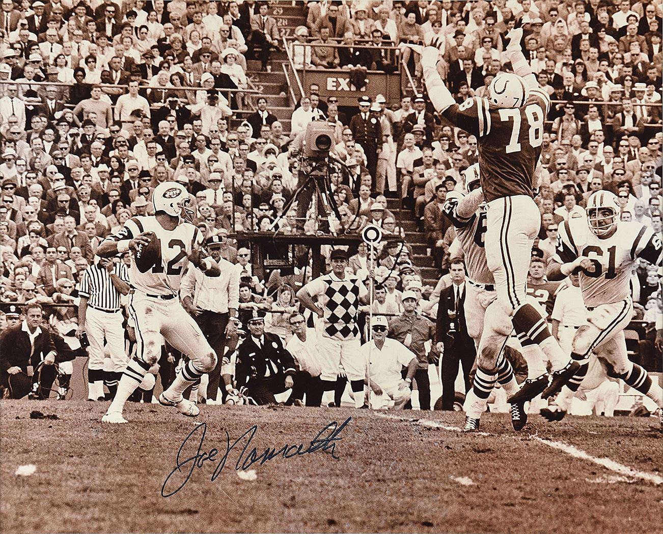 Impressive satin-finish 19.5 x 15.5 photo of Namath dropping back for the New York Jets, signed in black felt tip. Matted and framed to an overall size of 25.5 x 21.5. In fine condition.