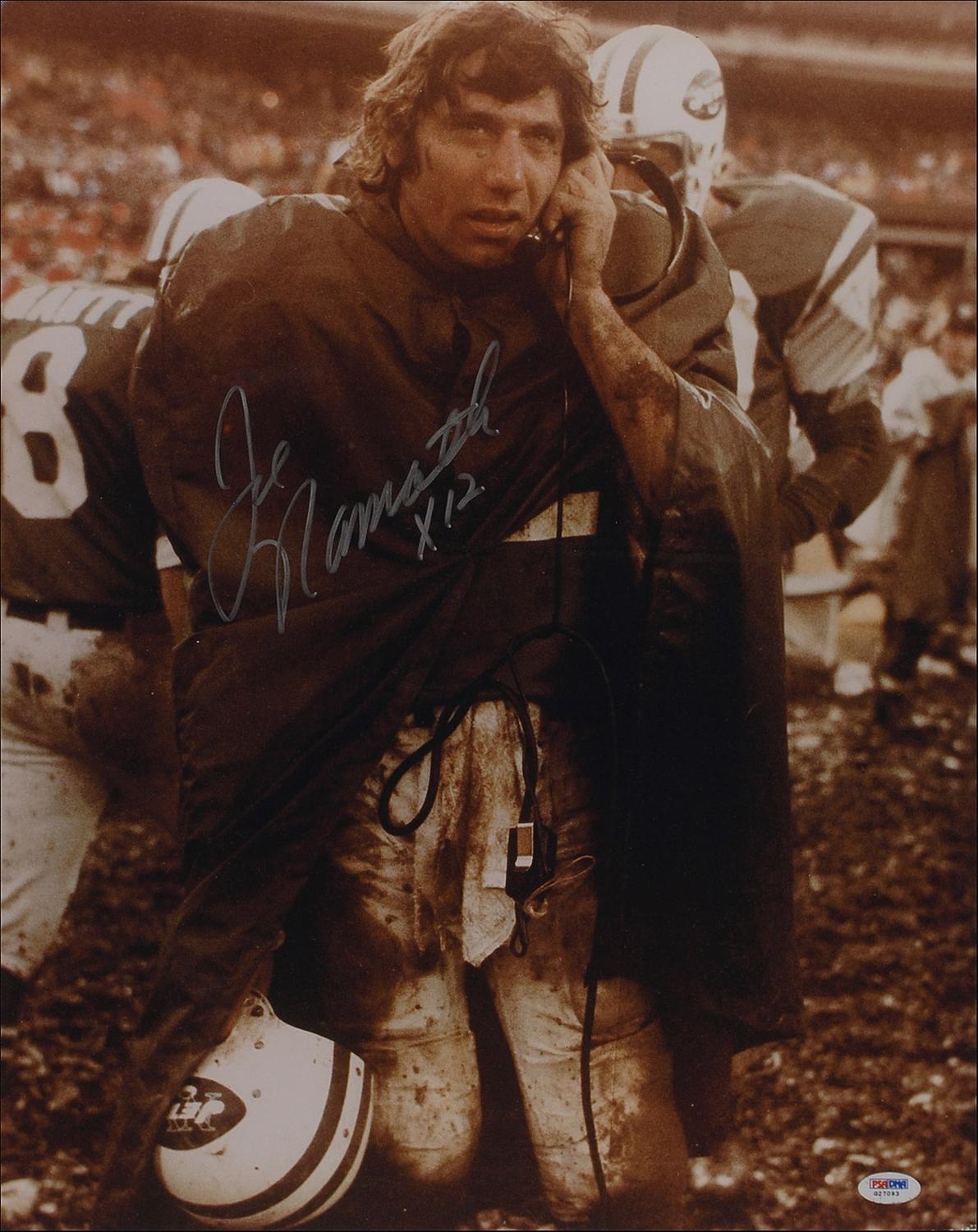 Color satin-finish 16 x 20 photo of a mud-covered Namath on the sidelines, signed in silver ink, “Joe Namath X12.” In fine condition, with a PSA/DNA authentication label affixed to the reverse; accompanied by a certificate of authenticity from PSA/DNA.