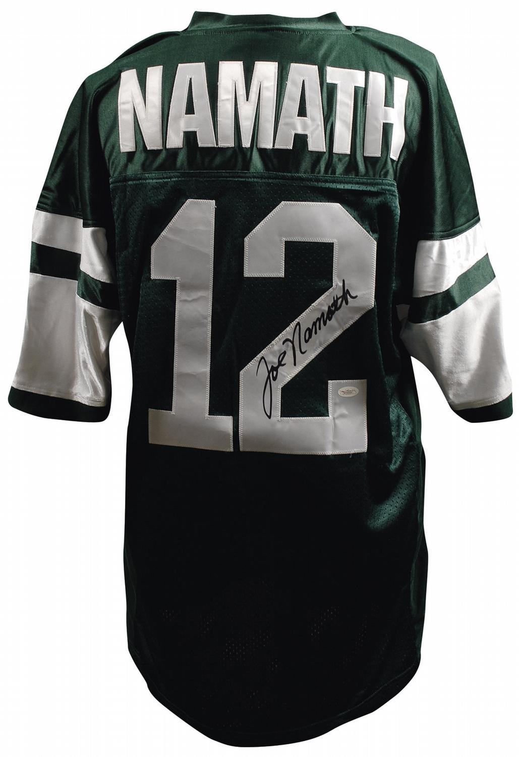 Replica New York Jets football jersey, with sewn on letters and numbers, boldly signed in black felt tip on the number on the back. In very fine condition, with a James Spence Authentication label affixed to the number. Accompanied by a certificate of authenticity from JSA.