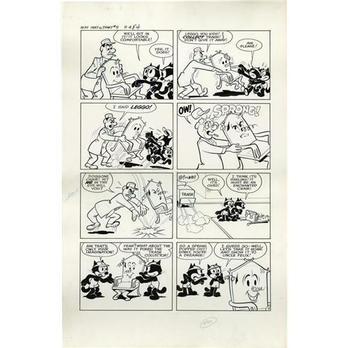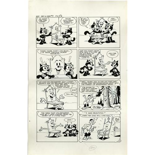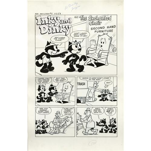 <B>Joe Oriolo - Felix's Nephews Inky and Dinky #5, Complete 17-page Story "The Enchanted Chair" Original Art (Harvey, 1958).</B></I> Inky and Dinky rescue an old chair from the trash, only to discover that the chair is enchanted, and was originally created for the king of Pineland. But an unscrupulous carpenter named Rasp took an axe and made Piney unfit for royal service. In this seventeen-page story, told in three chapters, Felix's nephews escort the chair back to Pineland and help restore him as the rightful throne to the king of Pineland! The image area of each page measures 12" x 18". Aside from some very light overall aging, the art is in Excellent condition.