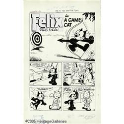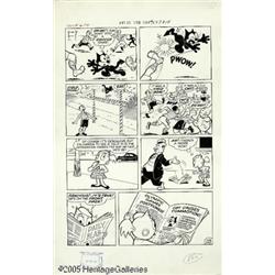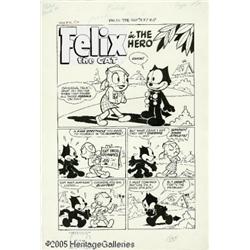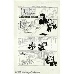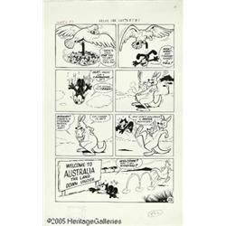 <B>Joe Oriolo - Felix the Cat #76 Complete 15-page Story "A Sporting Chance" Original Art (Harvey, 1956).</B></I> Felix begins his day by looking for a free meal, and soon hatches a hare-brained scheme to get fed by becoming a sports mascot. A sports theme is carried through three complete 5-page story-chapters, titled: "A Sporting Chance," "A Game Cat," and "The Hero." In these madcap adventures, Felix makes his way from America over to down-under Australia, just in time to compete in 1956's Melbourne-based Olympics. The yarns are chock-full of the hilarious and hallmarked graphic transformations and metamorphoses that were such a staple of Felix's animated antics. The image area of each page measures 12" x 18", and the art is in Excellent condition. Be sure to bid on this wonderful lot -- it's a grand slam! 15 Original Art