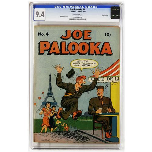 <B>Joe Palooka (1st series) #4 Crowley Copy pedigree (Columbia Comic Corporation, 1944) CGC NM 9.4 Off-white pages.</B></I> Joe's pal Jerry Leemy has a real <I>ooh la la</B></I> problem on this World War II cover illustration, which carries the signature of cartoonist Ham Fisher. This is the last of four issues published by Columbia Comics; after the war, the character moved over to Harvey for a long and successful run. Of the two copies of this issue currently listed in CGC's census report, this is by far the highest graded example. Overstreet 2005 NM- 9.2 value = $385. CGC census 12/05: 1 in 9.4, none higher.