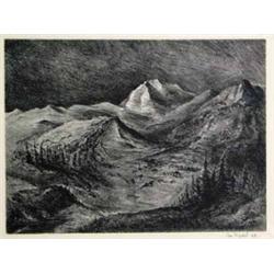 Joe Randel. Lithograph. Colorado Mountain Town. 1944. Pencil Signed. 9.5" x 13.5". Framed. Estimate $200 - $300.