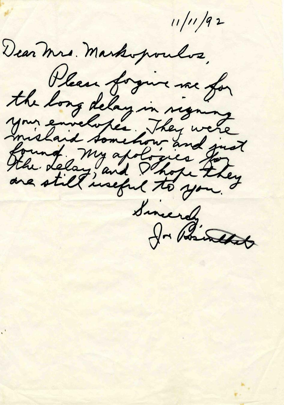 Nice Joe Rosenthal autograph letter signed dated 11 November 1992. Rosenthal responds to a request for his autograph: ''Dear Mrs. Markopoulos, Please forgive me for the long delay in signing your envelopes. They were mislaid somehow, and just found. My apologies for the delay, and I hope they are still useful to you. Sincerely, Joe Rosenthal.'' Letter on rice paper measures 8'' x 11''. Uneven left edge and light creasing, otherwise fine.