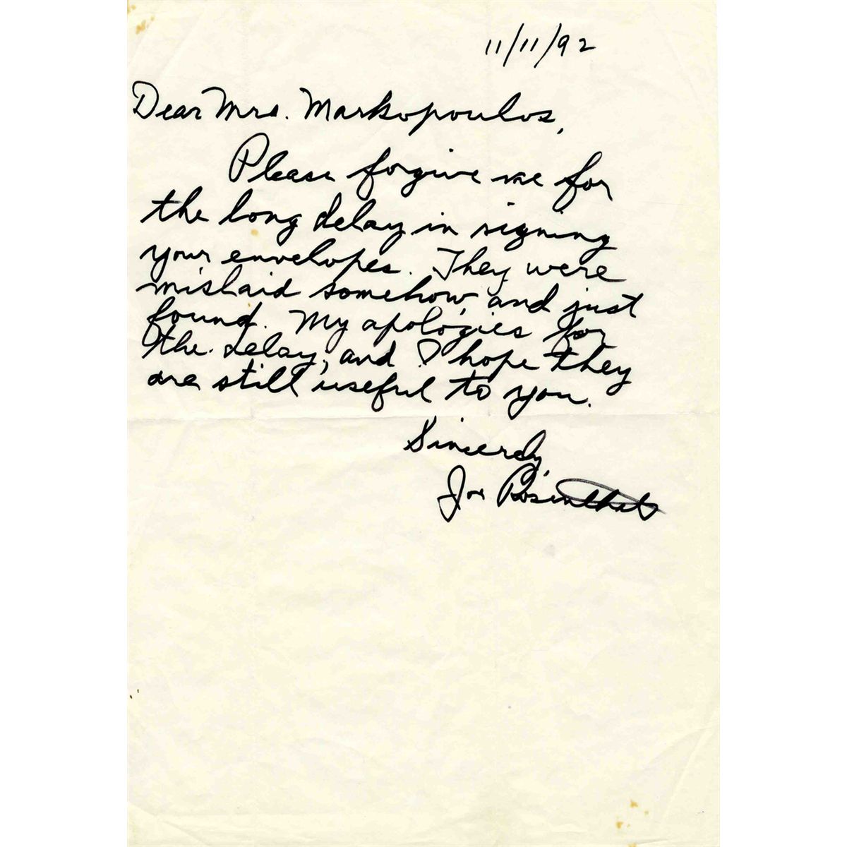 Nice Joe Rosenthal autograph letter signed dated 11 November 1992. Rosenthal responds to a request for his autograph: ''Dear Mrs. Markopoulos, Please forgive me for the long delay in signing your envelopes. They were mislaid somehow, and just found. My apologies for the delay, and I hope they are still useful to you. Sincerely, Joe Rosenthal.'' Letter on rice paper measures 8'' x 11''. Uneven left edge and light creasing, otherwise fine.