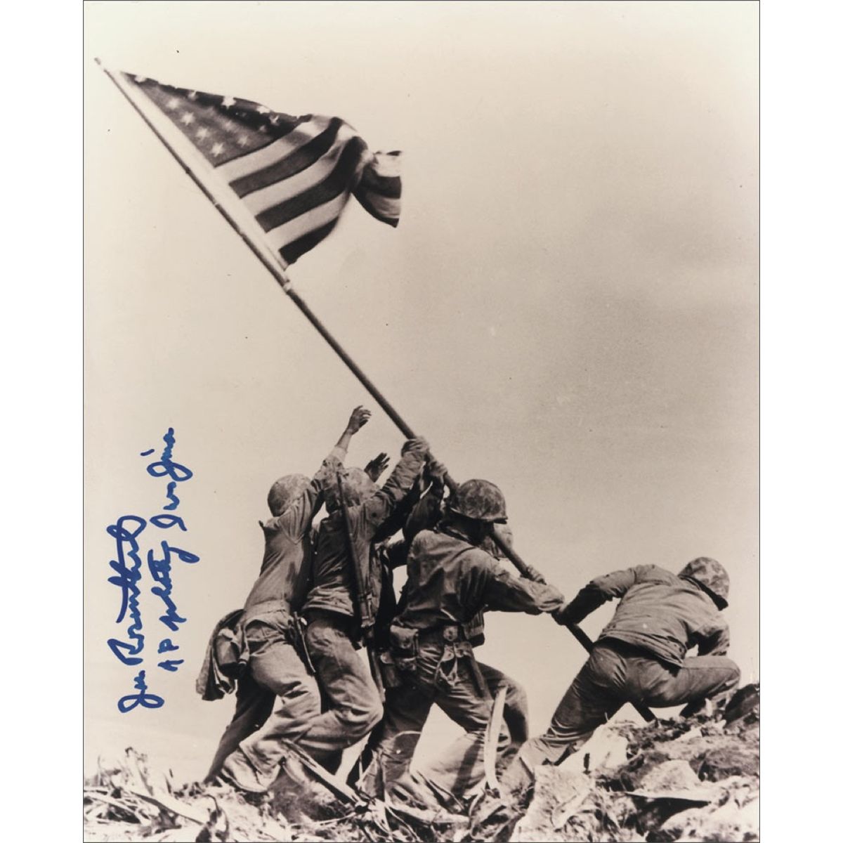 Glossy 8'' x 10'' photo of the Iwo Jima flag-raising, signed vertically in blue felt tip, ''Joe Rosenthal, AP photograph Iwo Jima.'' In fine condition, with some creasing to lower right corner.