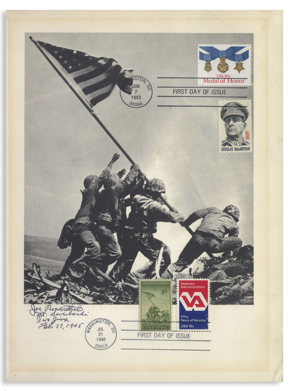 Joe Rosenthal signed print of the historic flag raising atop Mount Suribachi on Iwo Jima, marking the first successful U.S. beachhead on Japanese soil during World War II. Signed by Rosenthal underneath the photo, ''Joe Rosenthal / Mt. Suribachi / Iwo Jima / Febr 23, 1945''. Photo additionally shows two First Day of Issue postal cancellations, on 21 July 1980 commemorating the Veterans Administration, and on 7 June 1983 commemorating the U.S. Medal of Honor. Print measures 8.5'' x 11''. Uniform block of toning, light creasing at lower right corner, and a stray pencil mark at upper right. Overall in very good condition.