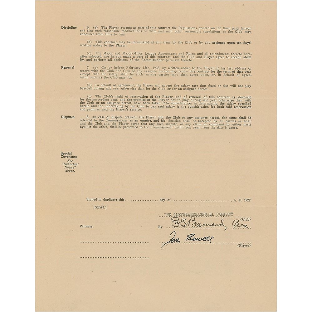Contract, four pages on two adjoining sheets, 8.5 x 11, [1927]. American League uniform player's contract in which Joe Sewell agrees to render "skilled services during the playing season of 1927" for the Cleveland Indians, for a salary of $11,500. Signed at the conclusion in fountain pen by Sewell, and countersigned by Indians President Ernest Barnard. In fine condition, with trivial paper loss to lower fold. Accompanied by a full letter of authenticity from PSA/DNA.