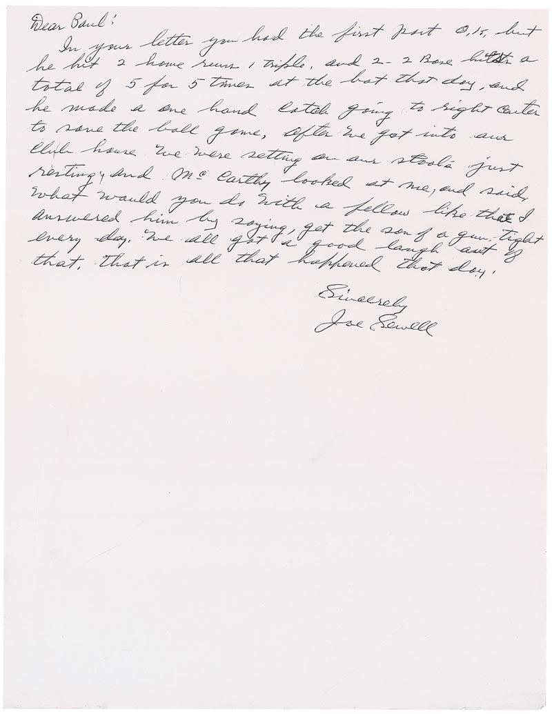 ALS, one page, 8.5 x 11, no date. Sewell writes to Paul. In part: “In your letter you had the first part O.K. but he hit 2 home runs, 1 triple, and 2 base hits a total of 5 for 5 times at the bat that day, and he made a one hand catch going to right center to save the ball game. After we got into our club house we were setting [sic] on our stools just resting, and McCarthy looked at me, and said, What would you do with a fellow like that? I answered him by saying, get the son of a gun tight every day. We all got a good laugh out of that. That is all that happened that day.” Mild handling wear, otherwise fine condition. Accompanied by the original letter to Sewell discussing the game in question.