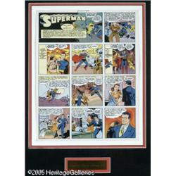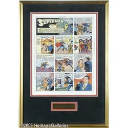 <B>Joe Shuster Studios - Superman Sunday Color Printer's Proof dated 1941 (McClure Newspaper Syndicate, 1941).</B></I> Up, up, and away! Offered here is a color printer's proof used in the newspaper production process in 1941. Superman nabs Lex Luthor and then turns him over to the cops. In Excellent condition, this 10.5" x 13.75" artifact has been attractively matted and framed, as well as being signed by Superman co-creator Jerry Siegel in the top margin.