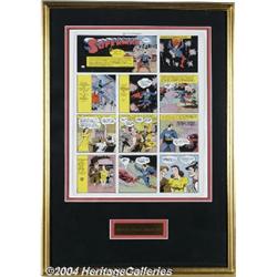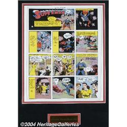 <B>Joe Shuster Studios - Superman Sunday Color Printer's Proof dated 1941 (McClure Newspaper Syndicate, 1941).</B></I> An interesting item, this is a color printer's proof used in the newspaper production process in 1941. In Excellent condition, this 10.5" x 13.75" beauty features the Man of Steel in full-tilt action throughout, as he battles a battalion of hurricane cars! Attractively matted and framed, this historic artifact has been signed by Superman co-creator Jerry Siegel in the top margin. <BR><BR><B>Important notice:</B> Heritage usually auctions material at the rate of 200-250 lots per hour. On some occasions eBay Live bid software or the Internet may not be able to keep up with the pace of the auction. We recommend placing a realistic absentee bid now as insurance to avoid disappointment. Occasionally the auctioneer may eliminate or reject an eBay Live bid, and the auctioneer may also reopen a lot after the close of the eBay live bidding (usually because we missed an audience bid), and may reject your bid even if it shows you as the winning bidder. By bidding via eBay Live, you agree that Heritage may award the lot to another bidder at its sole discretion under the circumstances described above or any other reasonable circumstances. Since eBay bids are not shown to us until we open the lot on the floor, we treat those bids just like floor bids. In most cases the floor responds before the eBay bid is presented to us, due to Internet lag time, so for consistency we have made it a policy that floor bids are always considered first over tie eBay live bids. Also please note that all Heritage lots purchased through eBay Live carry a 20% Buyer's Premium. Please make sure you read the Terms and Conditions before you bid.