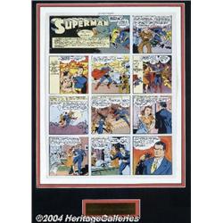 <B>Joe Shuster Studios - Superman Sunday Color Printer's Proof dated 1941 (McClure Newspaper Syndicate, 1941).</B></I> Up, up, and away! Offered here is a color printer's proof used in the newspaper production process in 1941. Superman nabs Lex Luthor and then turns him over to the cops. In Excellent condition, this 10.5" x 13.75" artifact has been attractively matted and framed, as well as being signed by Superman co-creator Jerry Siegel in the top margin. <BR><BR><B>Important notice:</B> Heritage usually auctions material at the rate of 200-250 lots per hour. On some occasions eBay Live bid software or the Internet may not be able to keep up with the pace of the auction. We recommend placing a realistic absentee bid now as insurance to avoid disappointment. Occasionally the auctioneer may eliminate or reject an eBay Live bid, and the auctioneer may also reopen a lot after the close of the eBay live bidding (usually because we missed an audience bid), and may reject your bid even if it shows you as the winning bidder. By bidding via eBay Live, you agree that Heritage may award the lot to another bidder at its sole discretion under the circumstances described above or any other reasonable circumstances. Since eBay bids are not shown to us until we open the lot on the floor, we treat those bids just like floor bids. In most cases the floor responds before the eBay bid is presented to us, due to Internet lag time, so for consistency we have made it a policy that floor bids are always considered first over tie eBay live bids. Also please note that all Heritage lots purchased through eBay Live carry a 20% Buyer's Premium. Please make sure you read the Terms and Conditions before you bid.