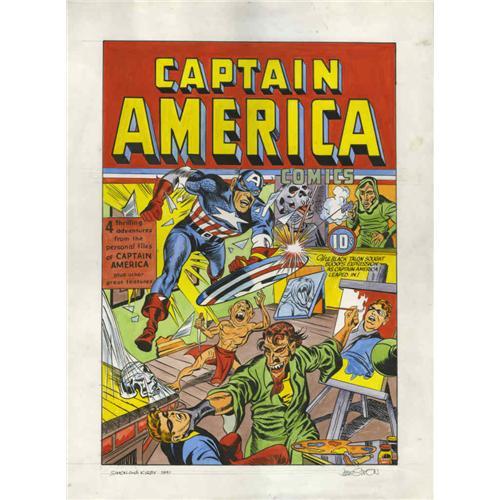<B>Joe Simon - Captain America Comics #9 Cover Recreation Original Art (undated).</B></I> "How could Captain America not have been a reaction to the times? The Nazis were a menace, an evil in the world. The U.S. hadn't yet entered the war when Jack and I did Captain America, so maybe he was our way at lashing out against the Nazi menace." So quotes Joe Simon, about his red, white, and blue co-creation with Jack Kirby. Offered here is a poster-sized recreation of <B>Captain America Comics</B></I> #9 by Joe Simon, featuring the star-spangled superhero as a two-fisted art critic, busting up a deadly artist modelling session. Rendered in ink and acrylic on heavy paper, this piece measures approximately 21.5" x 29", with an image area of 17" x 24". There are several paint smudges in the margins of the piece; otherwise the condition is Excellent. This piece is signed by Joe Simon in the lower right corner.