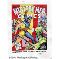 Joe Simon - Original Art Cover Recreation of Mystery Men Comics #11 (undated). One of the legends in the field, Joe Simon's career in comics has spanned decades. Best known as the co-creator of Captain America, Simon also brought The Fighting American and Boy's Ranch to life. More recently, Joe Simon has been favoring his Golden Age fans with stunning recreations of some of his most famous covers. Offered here is a poster-sized recreation of Mystery Men Comics #11, featuring the original Blue Beetle rescuing a fair maiden from a hideous fiend. Rendered in acrylic paint on heavy paper, this piece measures approximately 27" x 20.5", with an image area of approximately 21" x 16", and is signed by the artist in the lower right corner. There are several paint smudges in the margins of the piece, but these do not affect the art in any way. On the back, Simon has inscribed, "From a cover by Joe Simon in 1940. Drawn, designed and conceived by Joe Simon, editor and art director of Fox Comics. This recreation is acrylic color, India ink black-brush rendering by Joe Simon." Important notice: Heritage usually auctions material at the rate of 200-250 lots per hour. On some occasions eBay Live bid software or the Internet may not be able to keep up with the pace of the auction. We recommend placing a realistic absentee bid now as insurance to avoid disappointment. Occasionally the auctioneer may eliminate or reject an eBay Live bid, and the auctioneer may also reopen a lot after the close of the eBay live bidding (usually because we missed an audience bid), and may reject your bid even if it shows you as the winning bidder. By bidding via eBay Live, you agree that Heritage may award the lot to another bidder at its sole discretion under the circumstances described above or any other reasonable circumstances. Since eBay bids are not shown to us until we open the lot on the floor, we treat those bids just like floor bids. In most cases the floor responds before the eBay bid is presented to us, due to Internet lag time, so for consistency we have made it a policy that floor bids are always considered first over tie eBay live bids. Also please note that all Heritage lots purchased through eBay Live carry a 20% Buyer's Premium. Please make sure you read the Terms and Conditions before you bid.