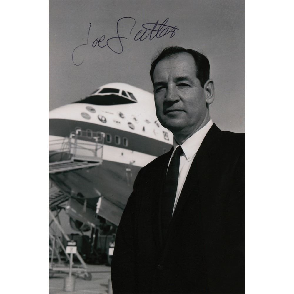 American engineer (1921-2016) for the Boeing Airplane Company and manager of the design team for the Boeing 747; Smithsonian Air and Space Magazine has described Sutter as the 'father of the 747.' Glossy 4 x 6 photo of Joe Sutter posing in front of the first Boeing 747, signed in black ballpoint. In very fine condition.