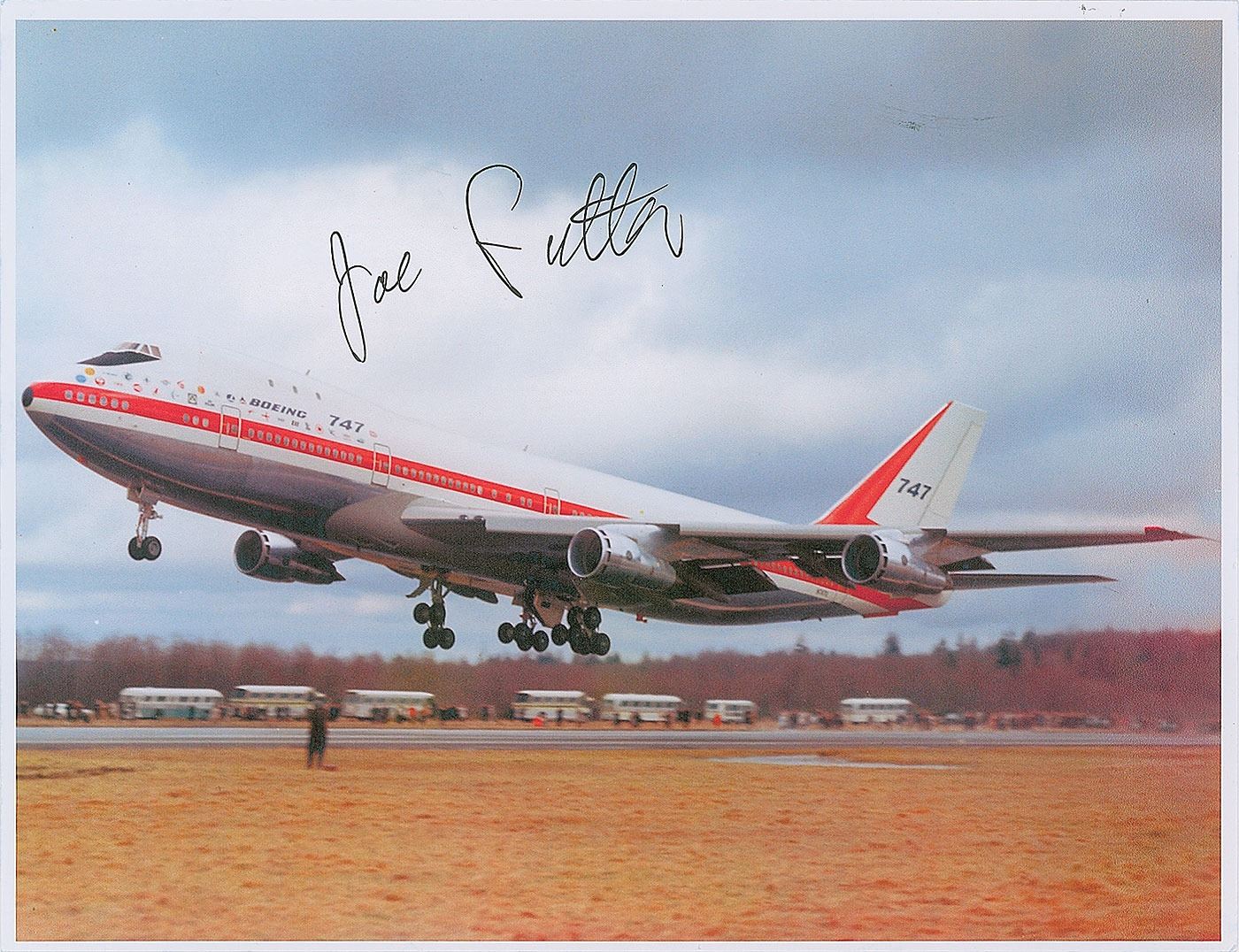 American engineer (1921–2016) for the Boeing Airplane Company and manager of the design team for the Boeing 747; Smithsonian Air and Space Magazine has described Sutter as the 'father of the 747.' Color 11 x 8.5 heavy paperstock photo of a Boeing 747 taking flight, signed in black ink by Sutter. In very fine condition.