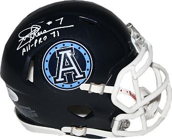 Joe Theismann was selected in the fourth round of the 1971 NFL Draft by the Miami Dolphins. After prolonged negotiations with the Dolphins failed, Theismann elected to sign with the Toronto Argonauts of the Canadian Football League for $50,000 per season. In his rookie year, Theismann quarterbacked the Argonauts to a 10–4 record, led the league's Eastern Conference in passing statistics and won a berth in the Grey Cup championship game in Vancouver, British Columbia versus the Calgary Stampeders (59th Grey Cup). Joe Theismann has hand autographed this Toronto Argonauts Speed Mini Helmet with All-Pro 71 inscription. JSA Hologram and Certificate of Authenticity.