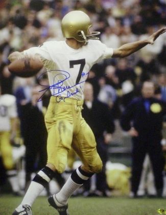 Joe Theismann attended and played college football for the University of Notre Dame. In 1969, Theismann led the Irish to a number five ranking and their first bowl appearance in 45 years. The next year, the Irish had a 10–1 record, a number two ranking, and won against Texas in the 1971 Cotton Bowl Classic, 24–11. That year, Theismann was an All-American and an Academic All-America, and was in contention for the Heisman Trophy. Theisman was inducted into the College Football Hall of Fame in 2003. Joe Theismann has hand autographed this Notre Dame Fighting Irish 16x20 Photo with Go Irish inscription. MAB hologram and Certificate of Authenticity from Athlon Sports.