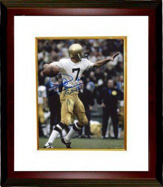 Joe Theismann attended and played college football for the University of Notre Dame. In 1969, Theismann led the Irish to a number five ranking and their first bowl appearance in 45 years. The next year, the Irish had a 10–1 record, a number two ranking, and won against Texas in the 1971 Cotton Bowl Classic, 24–11. That year, Theismann was an All-American and an Academic All-America, and was in contention for the Heisman Trophy. Theisman was inducted into the College Football Hall of Fame in 2003. Joe Theismann has hand autographed this Notre Dame Fighting Irish 8X10 Photo with Go Irish inscription. Leaf Authentics hologram and Certificate of Authenticity from Athlon Sports. Custom White Mat and Premium Mahogany Color Framed as shown.