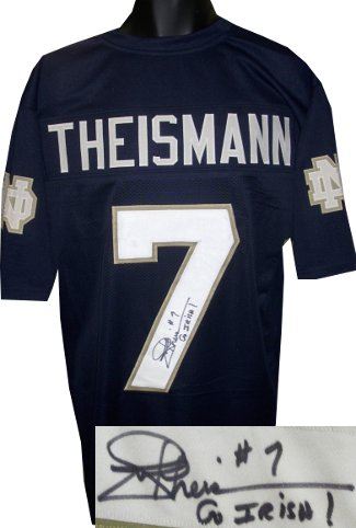 Joe Theismann attended and played college football for the University of Notre Dame. In 1969, Theismann led the Irish to a number five ranking and their first bowl appearance in 45 years. The next year, the Irish had a 10–1 record, a number two ranking, and won against Texas in the 1971 Cotton Bowl Classic, 24–11. That year, Theismann was an All-American and an Academic All-America, and was in contention for the Heisman Trophy. Theisman was inducted into the College Football Hall of Fame in 2003. Joe Theismann has hand autographed this Notre Dame Fighting Irish Navy Custom Jersey with Go Irish inscription. Certificate of Authenticity from Athlon Sports.