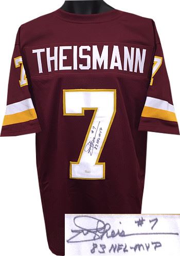 Joe Theismann led the Redskins to a win in Super Bowl XVII and an appearance in Super Bowl XVIII and would go on to set several Redskins franchise records, including most career passing attempts (3,602), most career passing completions (2,044) and most career passing yards (25,206), while also throwing 160 touchdown passes. He was the NFL's MVP in 1983. Joe Theismann Washington Redskins has hand signed this TB Maroon unlicensed custom-prostyle jersey with twill stitched nameplate and numbers with #7 83 NFL-MVP. Size XL. JSA Hologram and Certificate of Authenticity.