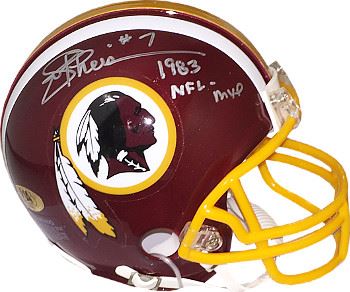Joe Theismann led the Redskins to a win in Super Bowl XVII and an appearance in Super Bowl XVIII and would go on to set several Redskins franchise records, including most career passing attempts (3,602), most career passing completions (2,044) and most career passing yards (25,206), while also throwing 160 touchdown passes. He was the NFL's MVP in 1983. Joe Theismann has hand autographed this Washington Redskins Riddell Mini Helmet with 1983 NFL MVP inscription. MAB Hologram and Certificate of Authenticity from Athlon Sports.
