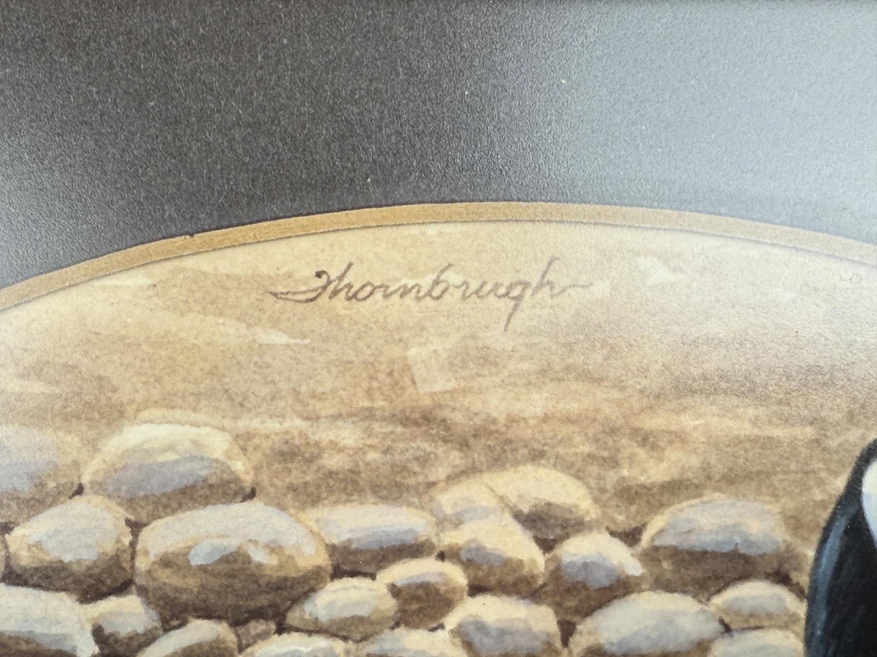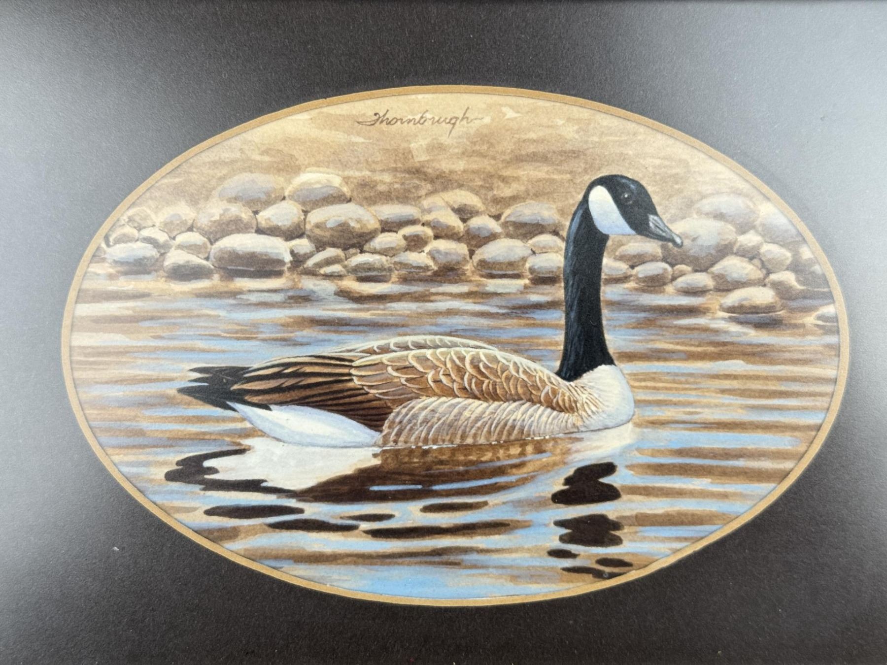 Title is Canada Goose. 3 1/2" by 5 3/8" unframed, 5 5/8" by 8 3/4" framed. Watercolor on Paper. Joseph Thornbrugh (Born 1948) is active/lives in Montana. Joseph Thornbrugh is known for Wildlife-birds, landscape.