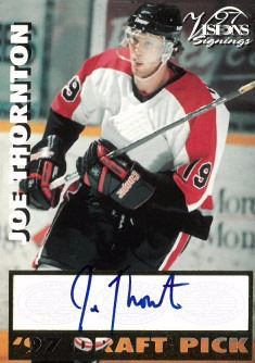 Joe Thornton was selected first overall by the Boston Bruins in the 1997 NHL Entry Draft and went on to play seven seasons with the club, three as its captain. During the 2005–06 season, he was traded to the Sharks. Splitting the campaign between the two teams, he received the Art Ross and Hart Memorial Trophies as the league's leading point-scorer and most valuable player, respectively.Joe Thornton has hand autographed this 1997 Draft Pick Scoreboard Hockey Card. Certificate of Authenticity from The Score Board