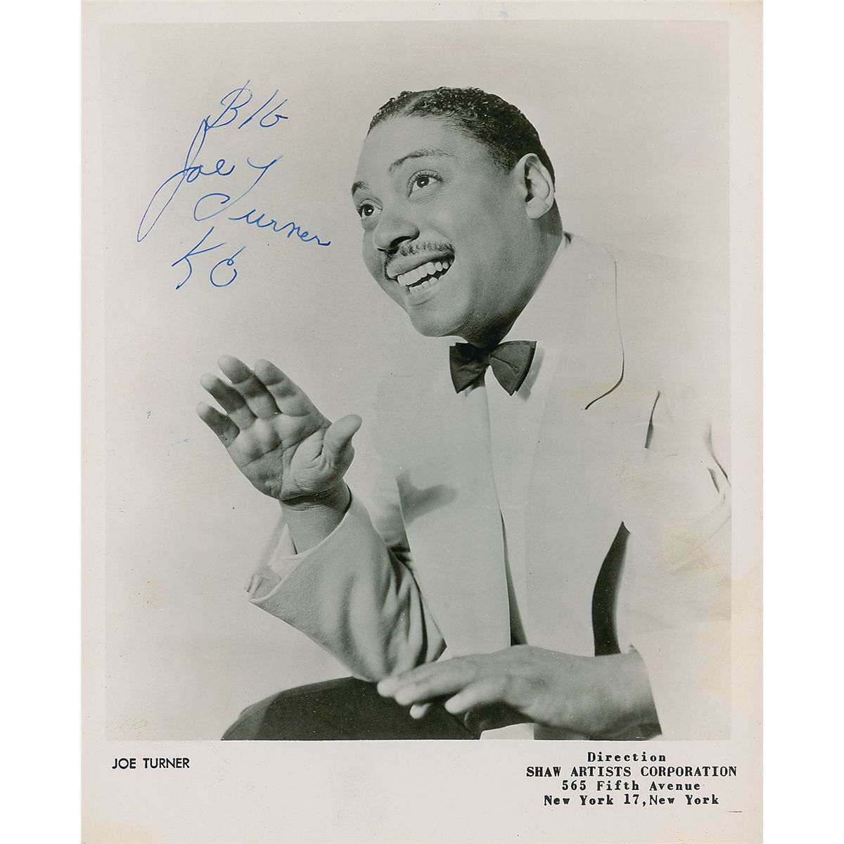 American blues shouter from Kansas City, Missouri (1911–1985). Vintage glossy 8 x 10 Shaw Artists Corporation publicity photo of Turner wearing a white suit and broadly smiling, signed in fountain pen, “Big Joe Turner, KC.” Light overall surface bends and creases, and a mild area of staining to the lower right, otherwise fine condition.
