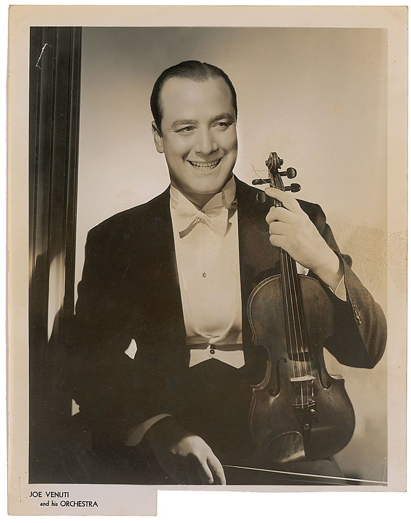 Jazz musician (1903–1978) who pioneered the use of violin in jazz during the 1920s. Vintage glossy 8 x 10 publicity photo of Venuti posing with his violin. In very good condition, with staple holes to corners and a large section of the lower border clipped off.