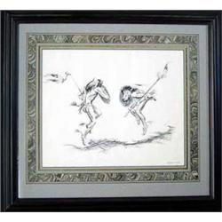 Joe Waano-Gano (1906-1982) (California) Ink. Buffalo Dancers. Sight Size 13" x 16". Studio Stamped lower right, circa 1930's. Estimate $500 - $750.