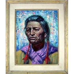 Joe Waano-Gano (1906-1982) (California) Oil on Canvas. "Two Guns White Calf." 24" x 15". signed lower right Two Guns was the son of White Calf, the last chief of the Blackfeet. Est $1,000 - $1,250.