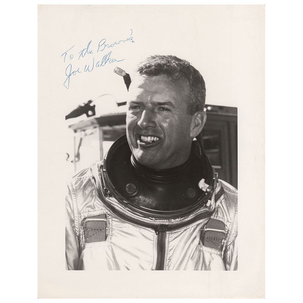 Vintage glossy 8 x 10.5 head-and-shoulders photo of Walker smiling in his X-15 flight suit, signed and inscribed in blue ballpoint, "To the Brownes! Joe Walker.‰Û In very good condition, with a paperclip impression to the top edge, scattered light creasing, and a heavier long vertical crease that passes through the tip of his left ear.